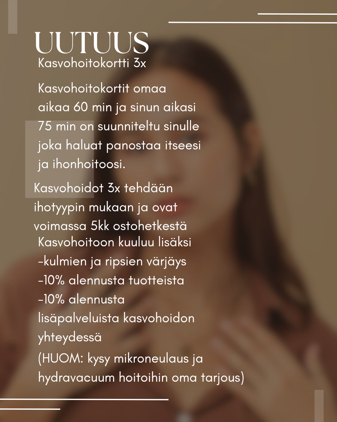 Kasvohoitokortin edut; Hoitoon kuuluu ripsien ja kulmien värjäys (arvo 20€ kert ), -10% tuotteista, -10% lisäpalveluista kasvohoidon yhteydessä.